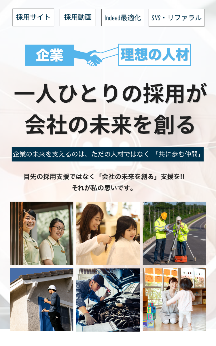 そんな悩みを抱える経営者・人事担当者のために、私たちは 「本気で会社を変えたい」 と思う企業に寄り添い、 最適な人材が自然に集まる採用の仕組みを構築します。